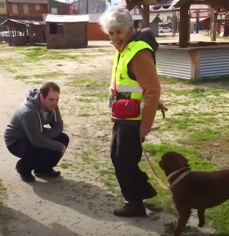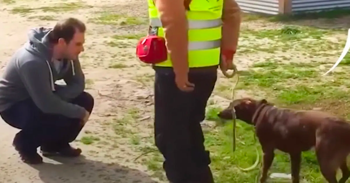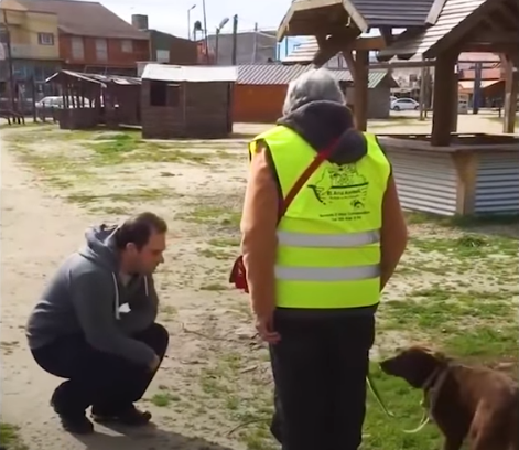 Staff from the animal shelter held the dog on the leash as it eyed the man warily and sniffed around him cautiously.