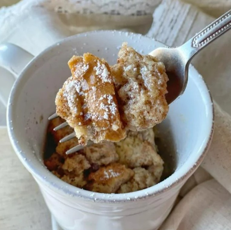 Cut the bread into bite-sized pieces, soak them in the egg mixture, and microwave for two minutes.