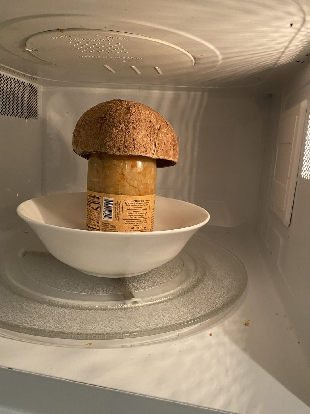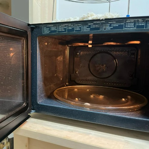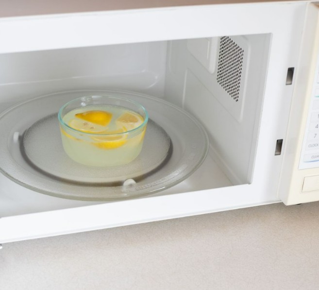 Just microwave a bowl of lemon water for five minutes—the steam will loosen grime, making it easy to wipe away with a cloth or paper towel.