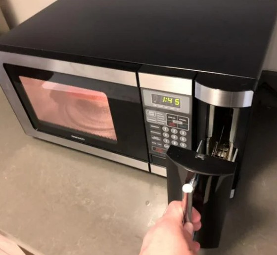 Just pour milk into a jar, shake until it gets bubbly, then microwave for 30 seconds.